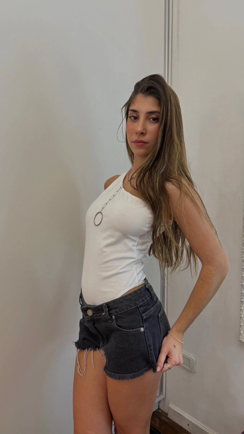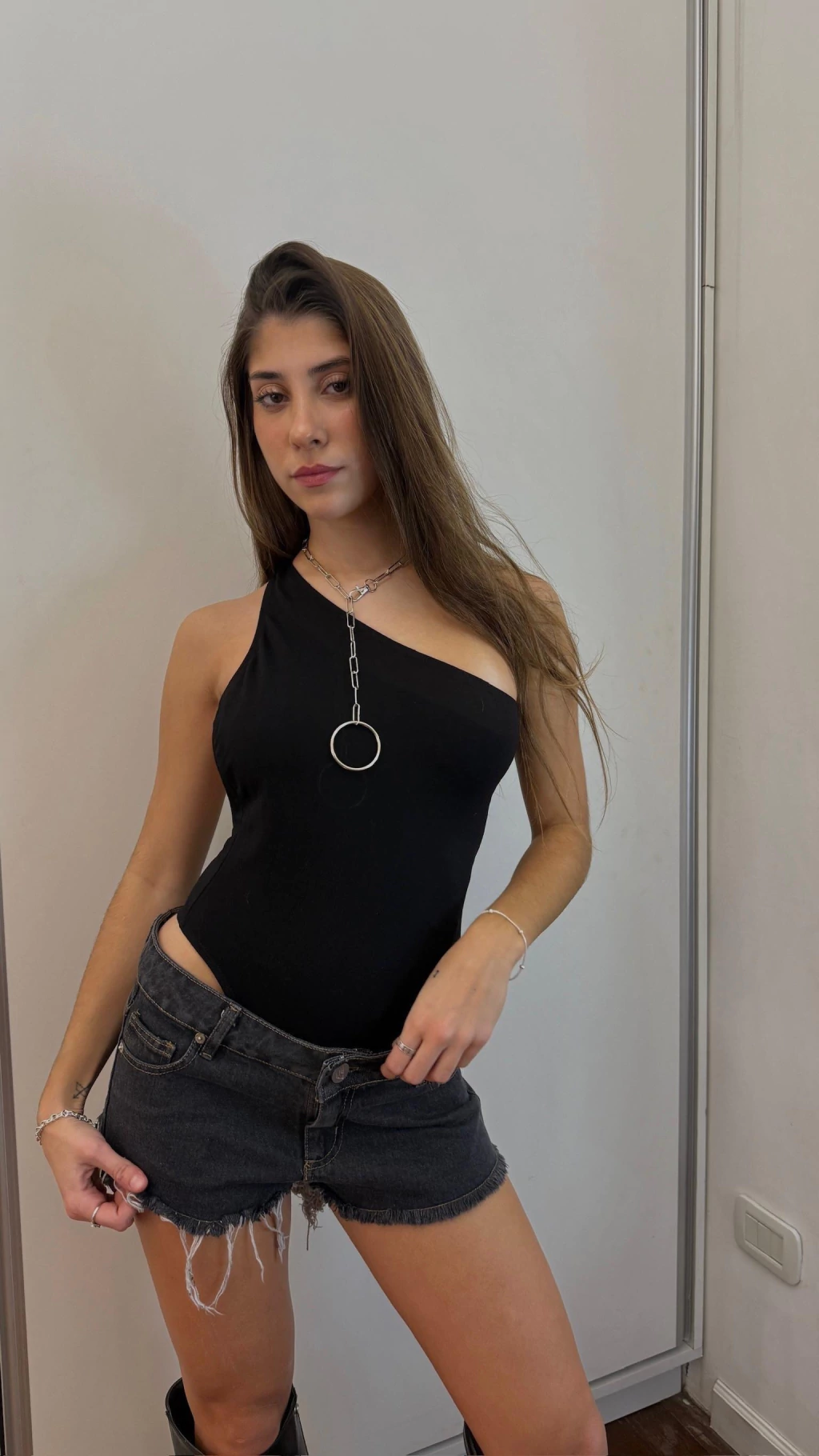 Body de punto roma al cuerpo con escote asimétrico. En la espalda, detalle de abertura y avío de pasador marcario. La prenda contiene una cinta bebé en su lateral para percha. Para facilitar acceso, broches snap en entrepierna y elástico interno en contorno de tiro para mejor ajuste de la prenda al cuerpo.
